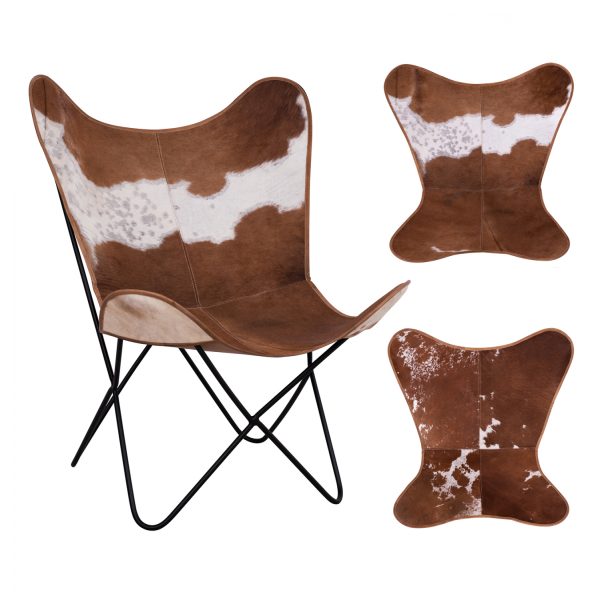 Μοντέρνα πολυθρόνα από μαύρο μεταλλικό σκελετό και γνήσιο δέρμα αγελάδος σε ασπρόμαυρη ή γκρι απόχρωση.