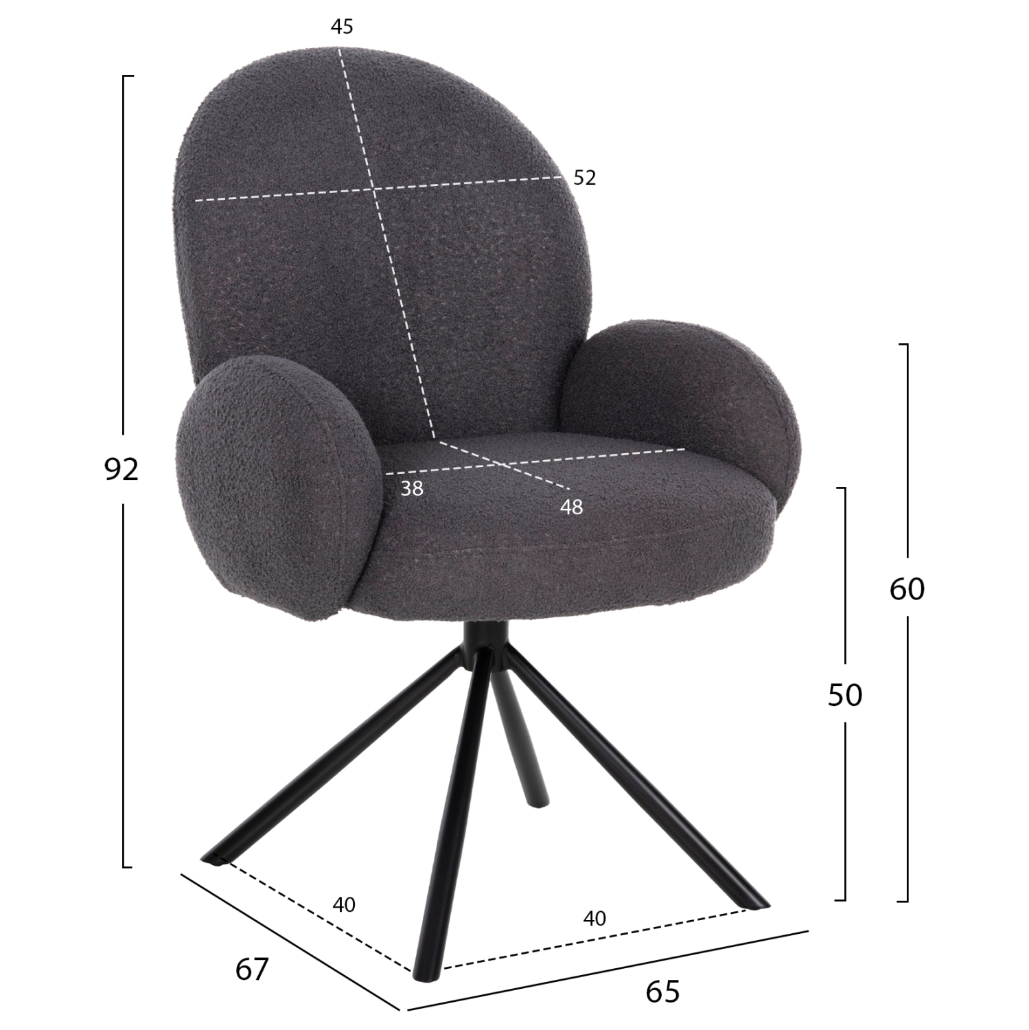 Σας παρουσιάζουμε την περιστρεφόμενη πολυθρόνα WINON σε ΣΚΟΥΡΟ ΓΚΡΙ χρώμα που είναι μια από τις καινούργιες προσθήκες στην γκάμα μας. Στηρίζεται σε μια μαύρη μεταλλική σαγρέ τετράνυχη βάση στην οποία είναι τοποθετημένος ο πίρος περιστροφής. Η επένδυση της πολυθρόνας έχει γίνει με υψηλής ποιότητας TEDDY ύφασμα και το κάθισμα είναι αναπαυτικό ανταποκρινόμενο στον χαρακτήρα της πολυθρόνας, η οποία είναι μοντέρνα συνδυάζοντας στιλ και άνεση. Το ιδιαίτερο χαρακτηριστικό της, είναι ότι η περιστρέφεται κατά 180 μοίρες και όχι πλήρως, και διαθέτει αυτόματη επαναφορά στην αρχική της θέση.