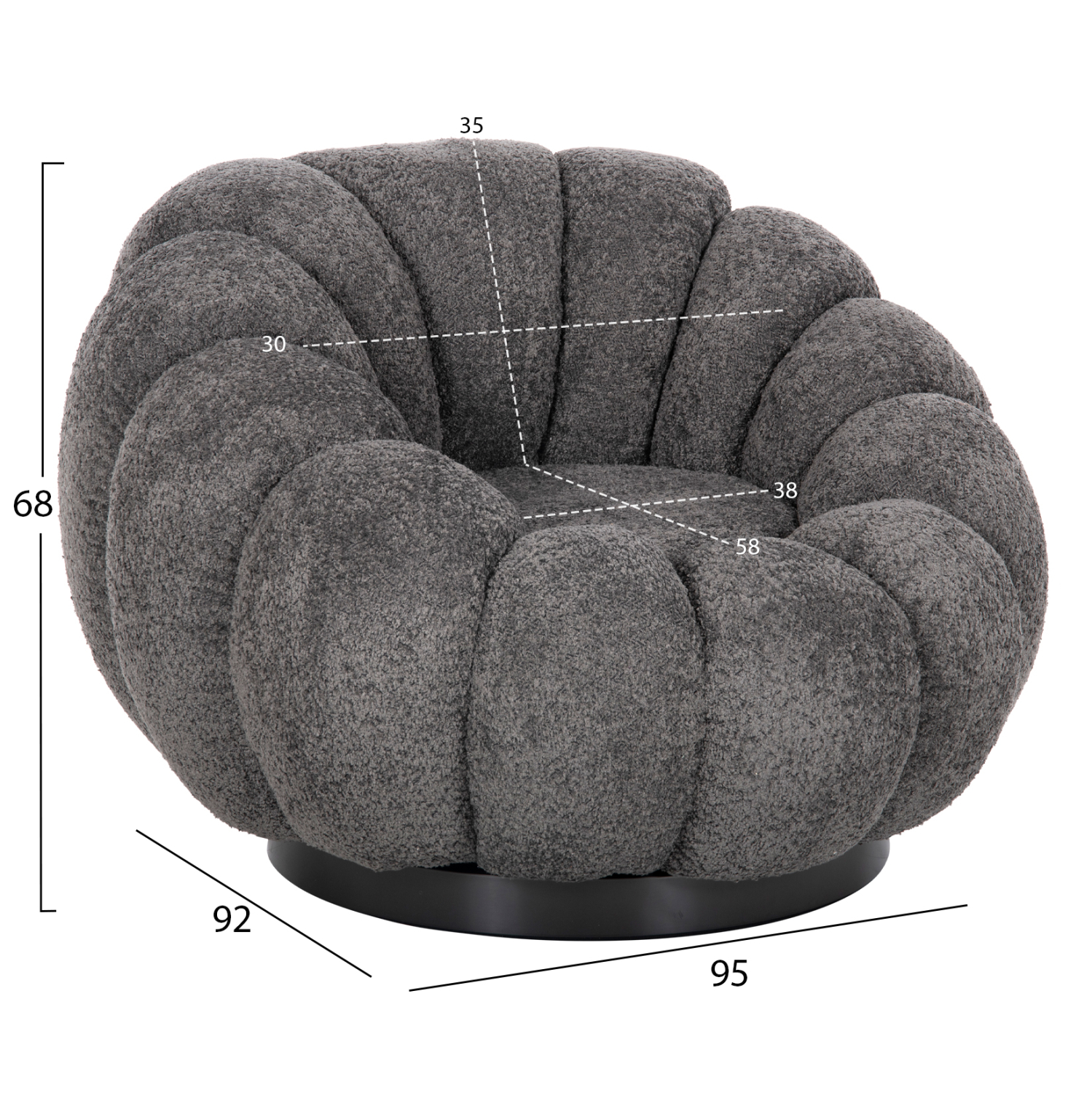 Σας παρουσιάζουμε την περιστρεφόμενη πολυθρόνα GRYMM σε ΓΚΡΙ χρώμα που είναι μια από τις καινούργιες προσθήκες στην γκάμα μας. Στηρίζεται σε μια μαύρη μεταλλική στρογγυλή βάση στην οποία είναι τοποθετημένος ο πίρος περιστροφής. Η επένδυση της πολυθρόνας έχει γίνει με υψηλής ποιότητας μπουκλέ ύφασμα και το κάθισμα είναι στρογγυλό και αναπαυτικό ανταποκρινόμενο στον χαρακτήρα της πολυθρόνας, η οποία είναι μοντέρνα συνδυάζοντας στιλ και άνεση. Τοποθετήστε την δίπλα στο τζάκι, σε ένα παράθυρο ή ακόμα και στο υπνοδωμάτιό σας, και αφεθείτε στην «αγκαλιά» της.