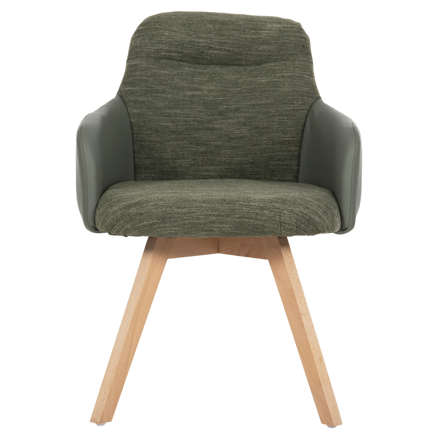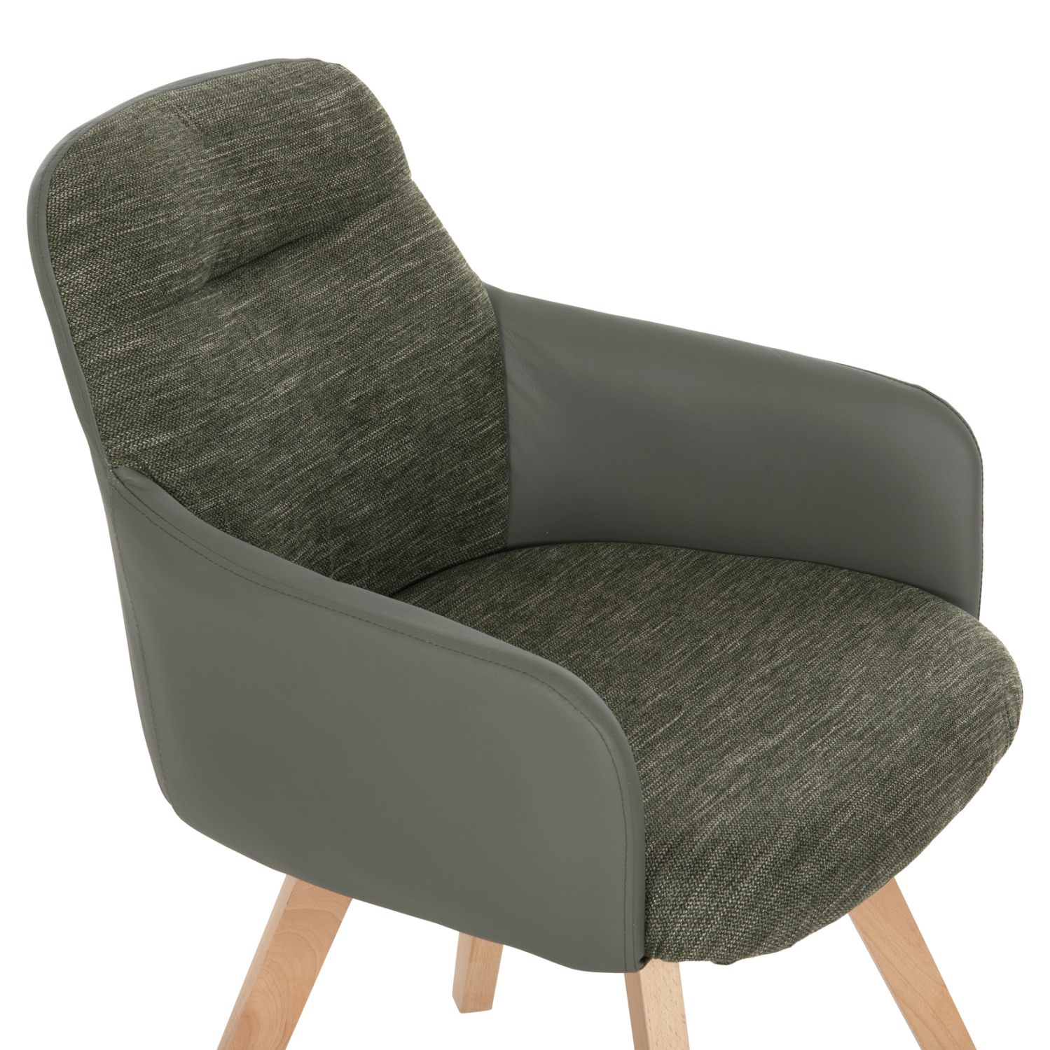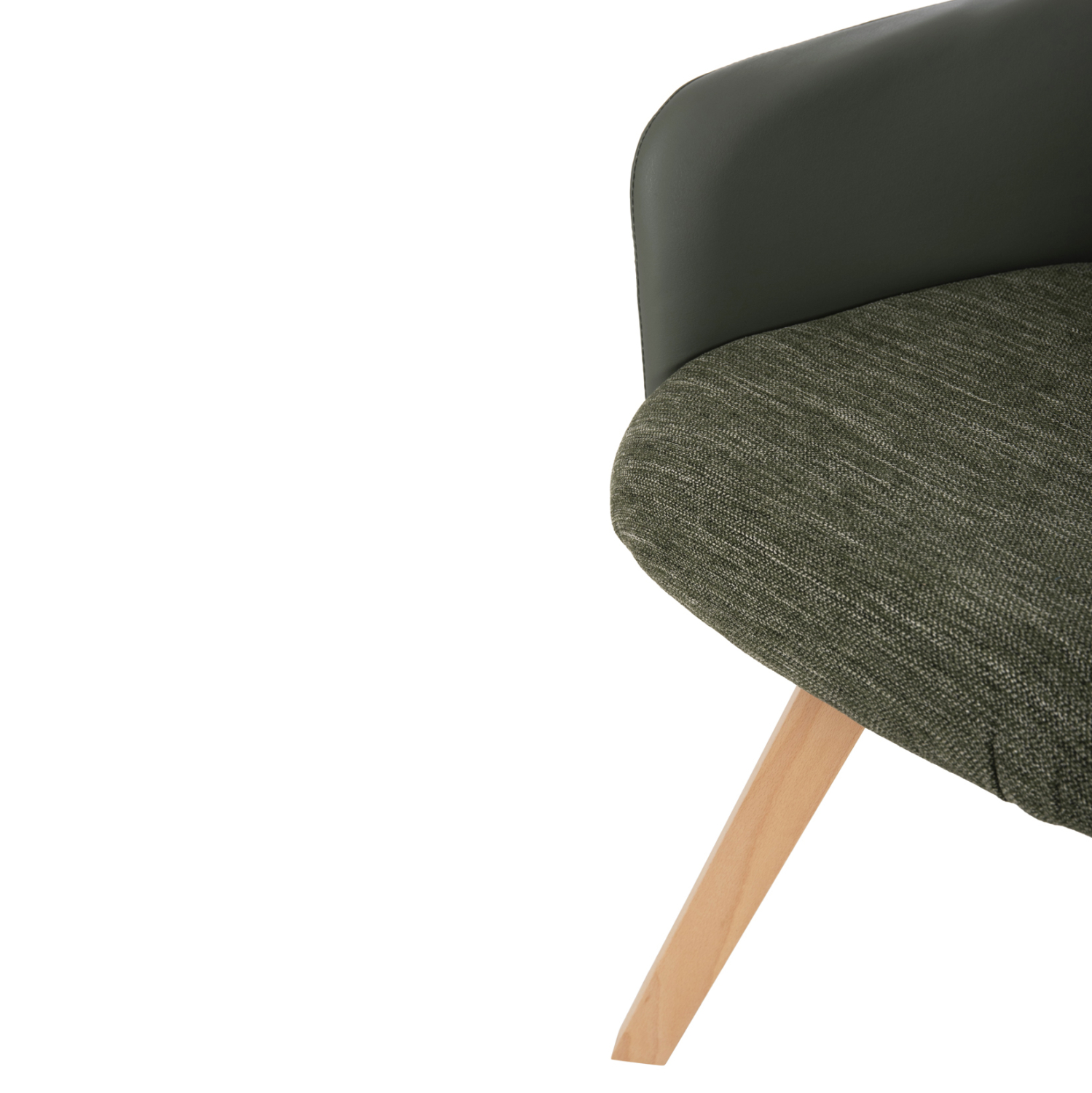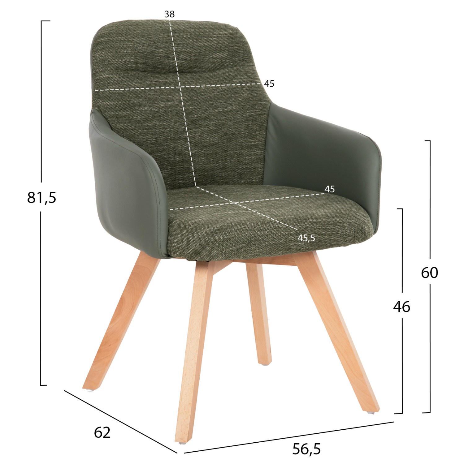 Το πολυθρονάκι DEW είναι μια πανέμορφη επιλογή για την τραπεζαρία σας. Η πλάτη είναι μεσαίου ύψους ενώ το κάθισμα είναι αναπαυτικό. Η πλάτη και το κάθισμα είναι επενδυμένα με ποιοτικό ύφασμα σε ΠΡΑΣΙΝΟ χρώμα, ενώ τα μπράτσα αλλά και το πίσω μέρος της πλάτης έχουν επένδυση από PU, επίσης σε ΠΡΑΣΙΝΟ χρώμα. Η στήριξη γίνεται με μια βάση και 4 πόδια από ξύλο οξιάς σε ΦΥΣΙΚΟ χρώμα.