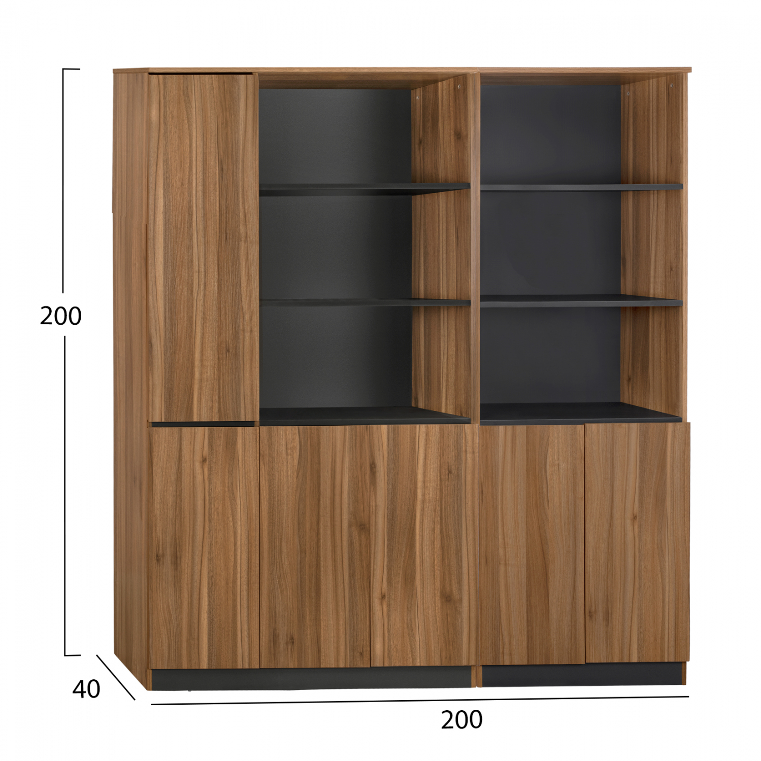 Διαθέτει τέσσερα ντουλάπια με εσωτερικό ράφι και έξι ανοιχτούς αποθηκευτικούς χώρους.