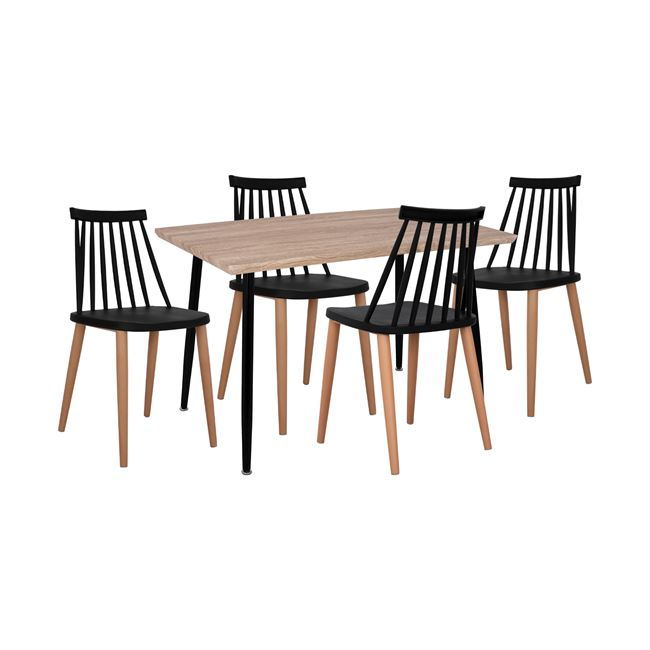 Τέσσερις καρέκλες με κάθισμα από πολυπροπυλένιο σε μαύρη απόχρωση και μεταλλικά πόδια με απόδοση στο φυσικό χρώμα του ξύλου.
