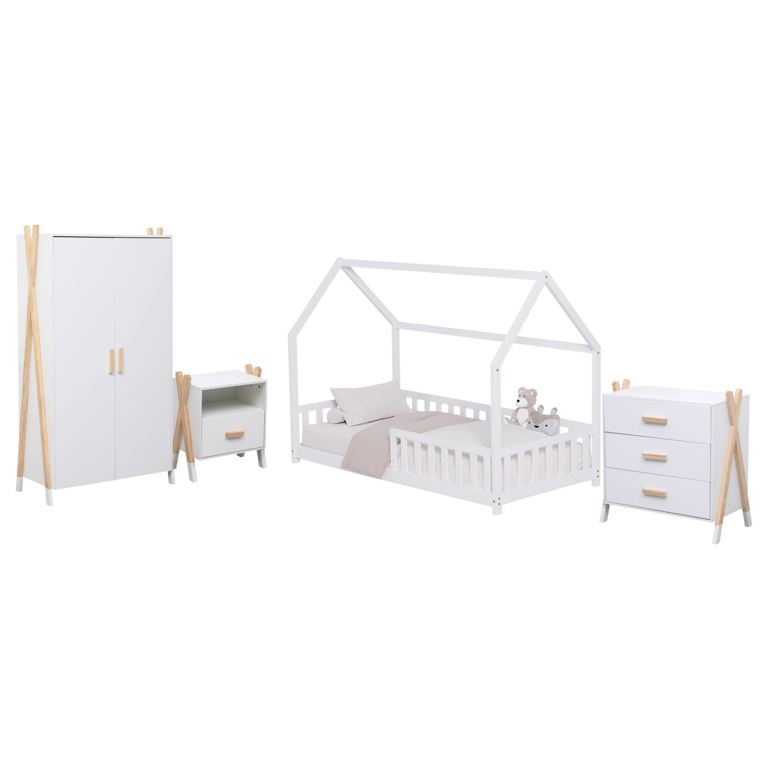 To σετ για παιδικό δωμάτιο PASCHAL περιλαμβάνει ένα κομοδίνο, ένα κρεβάτι τύπου Montessori με περιμετρικά κάγκελα, μια ντουλάπα, και μια συρταριέρα! Αναλυτικά:
