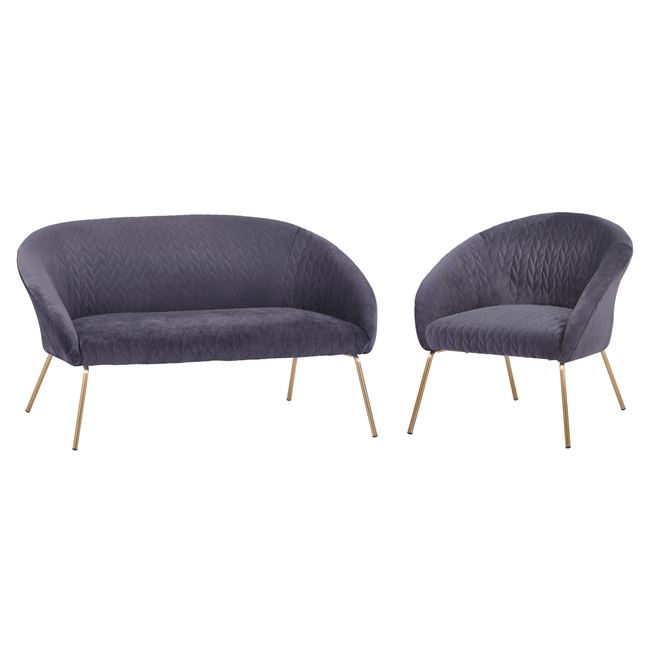 Σετ σαλόνι 2 τεμαχίων JOYTE, κατασκευασμένο από γκρι βελούδο και μεταλλικά πόδια σε χρυσή απόχρωση.