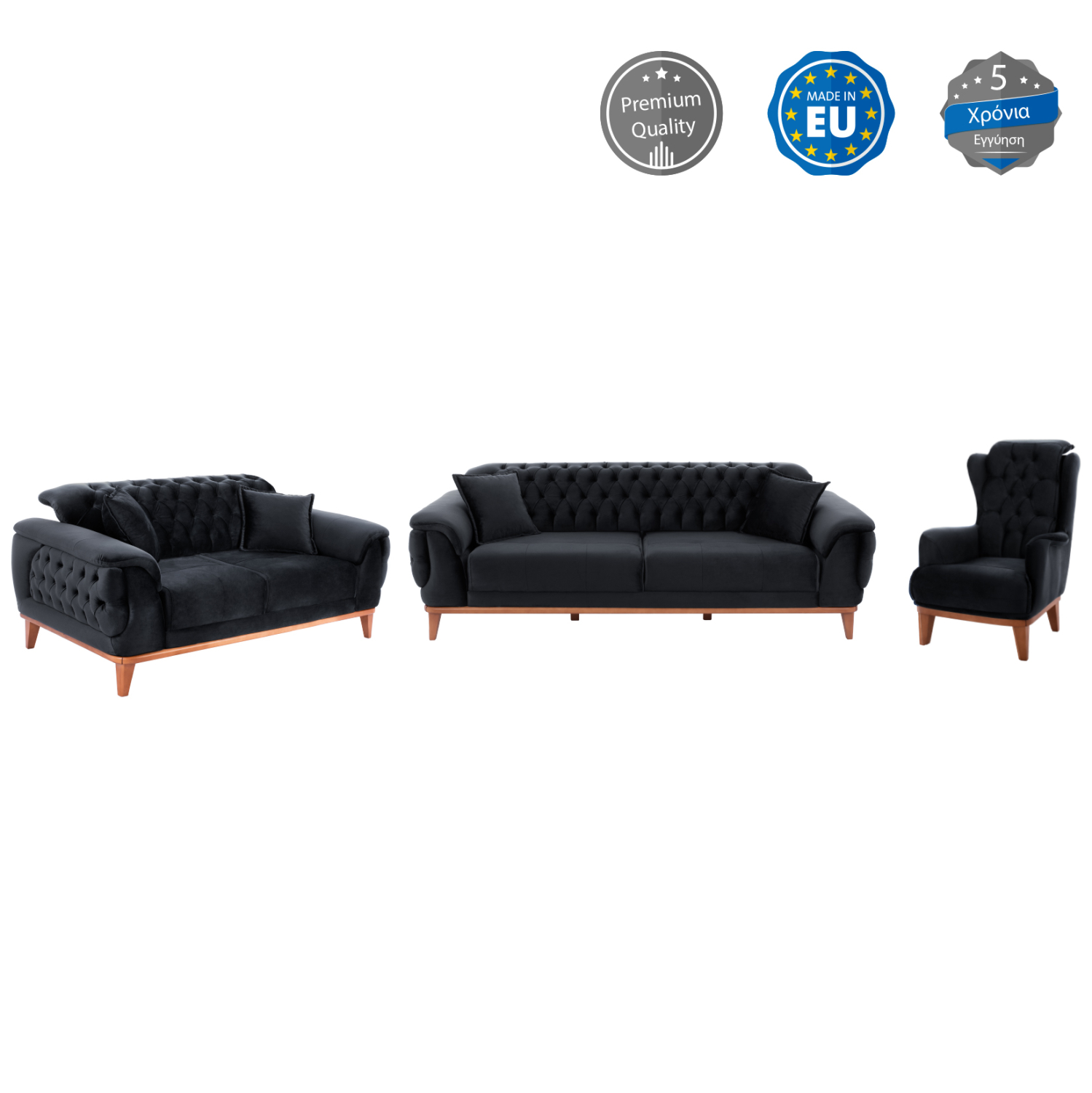 Θεωρείτε ότι ήρθε η ώρα να ανανεώσετε το σαλόνι σας με κάτι εντυπωσιακό; Μην ψάχνετε άλλο. Το σετ ΗΜ11745.01 με την 5-ετή εγγύηση στον σκελετό του κάθε τεμαχίου, καλύπτει όλα τα «θέλω» σας. Άπλετος χώρος για 6 άτομα και δυνατότητα νυχτερινής φιλοξενίας 2 ατόμων μιας και οι δύο καναπέδες μετατρέπονται ΚΑΙ σε κρεβάτια με τον απλούστερο μηχανισμό της αγοράς. Το εντυπωσιακό ΜΑΥΡΟ καπιτονέ που κυριαρχεί σε όλο το σετ, και η όμορφη διχρωμία με τα ψηλά ξύλινα πόδια και το πλαίσιο σε φυσικό χρώμα θα προκαλέσουν τον θαυμασμό όλων, με την εντυπωσιακή και αναπαυτική μπερζέρα να αποτελεί το σημείο αναφοράς.