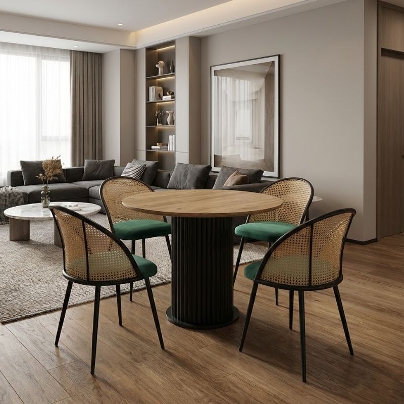 Η τραπεζαρία Bohema – Jacob συνδυάζει την πλούσια υφή του βελούδου της καρέκλας με τη στιβαρότητα του μεταλλικού σκελετού, δημιουργώντας μια ιδανική ισορροπία ανάμεσα στην αισθητική και τη λειτουργικότητα. Η εντυπωσιακή πλάτη από PE rattan προσδίδει κομψότητα και χαρακτήρα στον χώρο. Αποτελεί ιδανική επιλογή τόσο για τη τραπεζαρία ενός μοντέρνου σπιτιού όσο και για επαγγελματικούς χώρους, όπως καφέ, εστιατόρια ή Airbnb, όπου η λεπτομέρεια και το design κάνουν τη διαφορά.