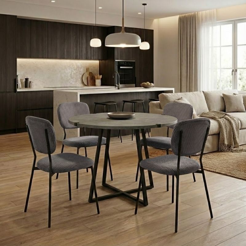 Η τραπεζαρία Rubes – Kevin θα φέρει μία αίσθηση εκλεπτυσμένης κομψότητας στον χώρο σας. Το πλούσιο κοτλέ ύφασμα της καρέκλας χαρίζει ζεστασιά και υφή, ενώ τα μεταλλικά πόδια προσδίδουν μοντέρνο χαρακτήρα και σταθερότητα. Ιδανική επιλογή τόσο για το σπίτι όσο και για επαγγελματικούς χώρους που θέλουν να επικοινωνήσουν ποιότητα και design σε κάθε λεπτομέρεια.