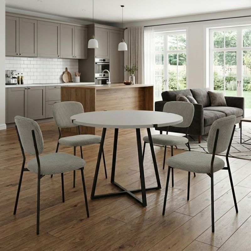 Η τραπεζαρία Rubes – Kevin θα φέρει μία αίσθηση εκλεπτυσμένης κομψότητας στον χώρο σας. Το πλούσιο κοτλέ ύφασμα της καρέκλας χαρίζει ζεστασιά και υφή, ενώ τα μεταλλικά πόδια προσδίδουν μοντέρνο χαρακτήρα και σταθερότητα. Ιδανική επιλογή τόσο για το σπίτι όσο και για επαγγελματικούς χώρους που θέλουν να επικοινωνήσουν ποιότητα και design σε κάθε λεπτομέρεια.