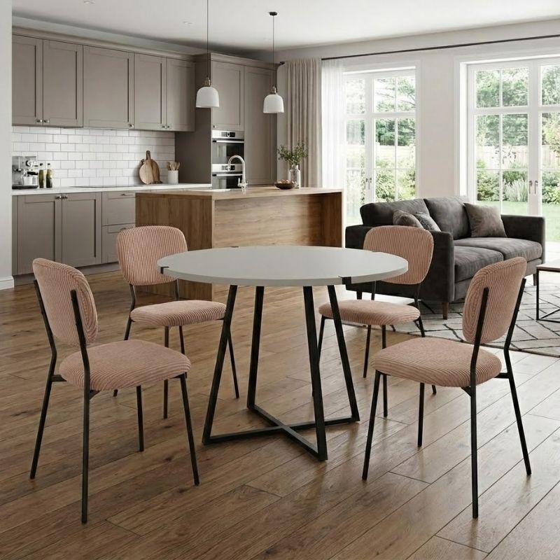 Η τραπεζαρία Rubes – Kevin θα φέρει μία αίσθηση εκλεπτυσμένης κομψότητας στον χώρο σας. Το πλούσιο κοτλέ ύφασμα της καρέκλας χαρίζει ζεστασιά και υφή, ενώ τα μεταλλικά πόδια προσδίδουν μοντέρνο χαρακτήρα και σταθερότητα. Ιδανική επιλογή τόσο για το σπίτι όσο και για επαγγελματικούς χώρους που θέλουν να επικοινωνήσουν ποιότητα και design σε κάθε λεπτομέρεια.
