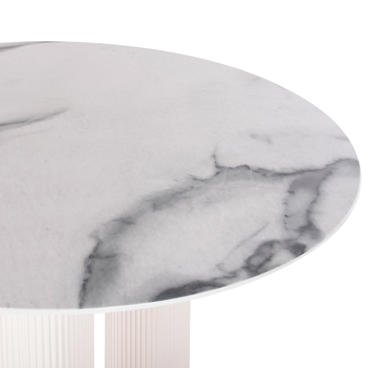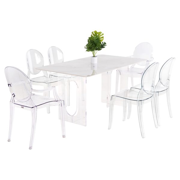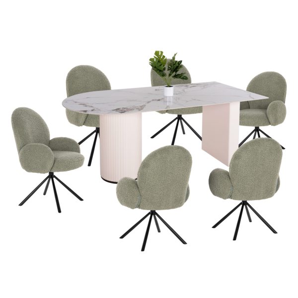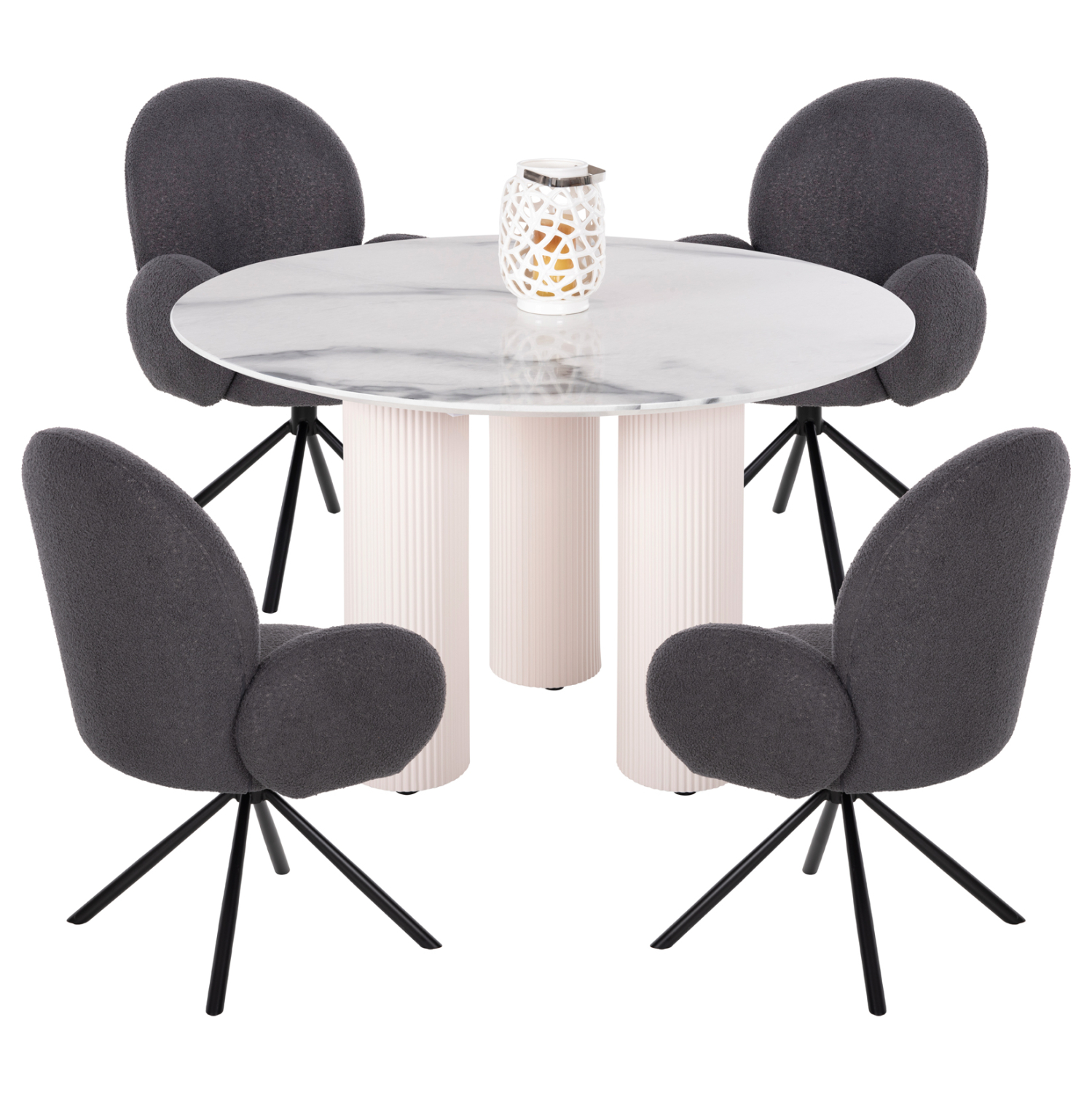 Αυτό το σετ τραπεζαρίας εσωτερικού χώρου αποτελείται από ένα τραπέζι DORIK και 4 πολυθρόνες WINON. Το DORIK είναι ένα στρογγυλό τραπέζι για την τραπεζαρία, με επιφάνεια από MDF σε χρώμα ΛΕΥΚΟΥ ΜΑΡΜΑΡΟΥ. Τα 3 πόδια σε στυλ κολώνας είναι επίσης ΛΕΥΚΑ. Οι πολυθρόνες WINON σε ΓΚΡΙ χρώμα στηρίζονται σε μια μαύρη μεταλλική σαγρέ τετράνυχη βάση στην οποία είναι τοποθετημένος ο πίρος περιστροφής, καθώς το ιδιαίτερο χαρακτηριστικό τους, είναι ότι η περιστρέφονται κατά 180 μοίρες και όχι πλήρως, και διαθέτουν αυτόματη επαναφορά στην αρχική τους θέση. Η επένδυση τους έχει γίνει με υψηλής ποιότητας TEDDY ύφασμα.