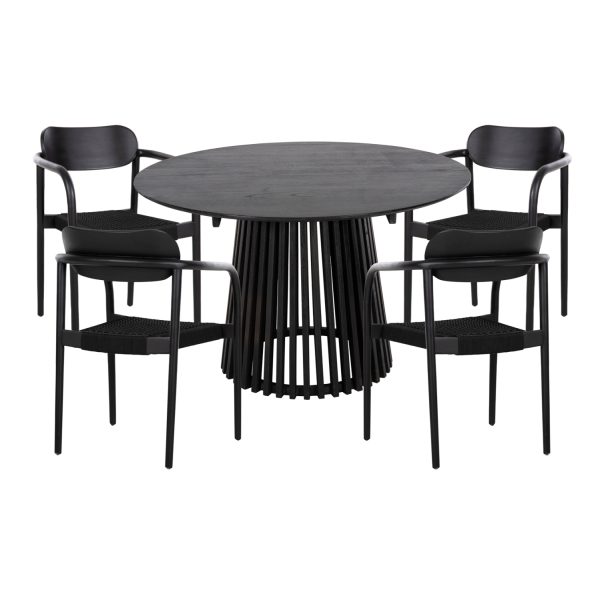 Αυτό το σετ τραπεζαρίας εσωτερικού χώρου 5τμχ αποτελείται από ένα στρογγυλό τραπέζι FRANTZ κατασκευασμένο εξολοκλήρου από ξύλο MINDI σε ΜΑΥΡΟ χρώμα, και από 4 καρέκλες τραπεζαρίας KINGSLEY κατασκευασμένες εξολοκλήρου από ξύλο μαόνι με κάθισμα από PU δέρμα, σε χρώμα ΜΑΥΡΟ ΒΙΝΥΛΙΟΥ.