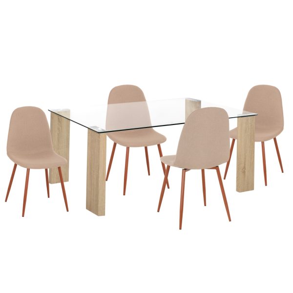Ένα ορθογώνιο τραπέζι με πόδια από MDF σε SONAMA χρώμα και γυάλινη επιφάνεια, και 4 καρέκλες με πόδια μεταλλικά με όψη ξύλου και κάθισμα με επένδυση από καφετί ύφασμα.