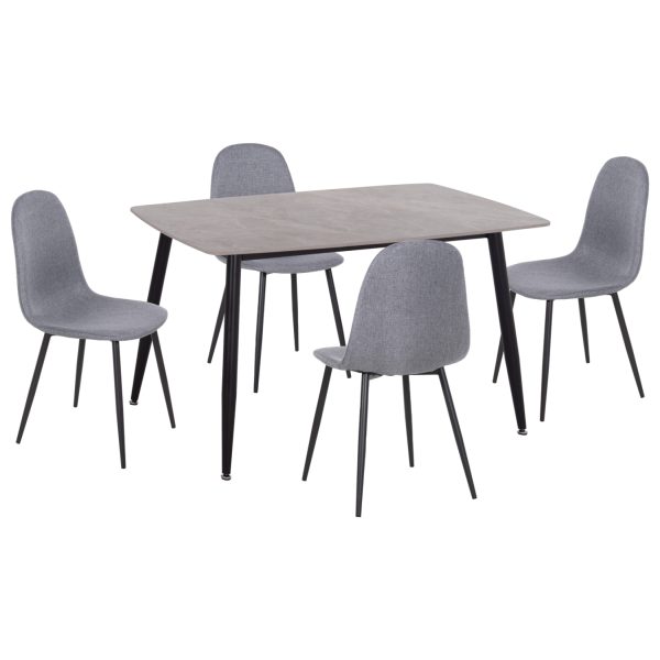 Ένα ορθογώνιο τραπέζι με σκελετό μεταλλικό σε ΜΑΥΡΟ χρώμα και κεραμική επιφάνεια με όψη ΜΑΥΡΟΥ ΜΑΡΜΑΡΟΥ, και 4 καρέκλες με πλάτη και κάθισμα με επένδυση από ύφασμα σε ΓΚΡΙ χρώμα και μεταλλικά πόδια σε ΜΑΥΡΟ χρώμα.