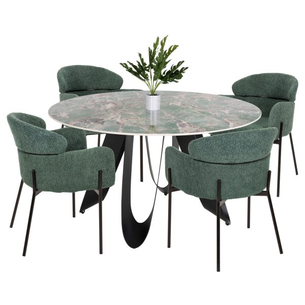 Αυτό το σετ τραπεζαρίας εσωτερικού χώρου αποτελείται από ένα τραπέζι και 6 καρέκλες. Το τραπέζι είναι ορθογώνιο με γυαλιστερή κεραμική επιφάνεια σε ΛΕΥΚΟ χρώμα, ενώ τα όμορφα πόδια είναι μεταλλικά σε ΜΑΥΡΟ χρώμα. Οι καρέκλες έχουν μπουκλέ ύφασμα σε χρώμα ΕΚΡΟΥ. Το σετ αυτό θα δώσει μια πολυτελή εικόνα σε κάθε χώρο τραπεζαρίας, είτε στο σπίτι, είτε σε επαγγελματικό χώρο.