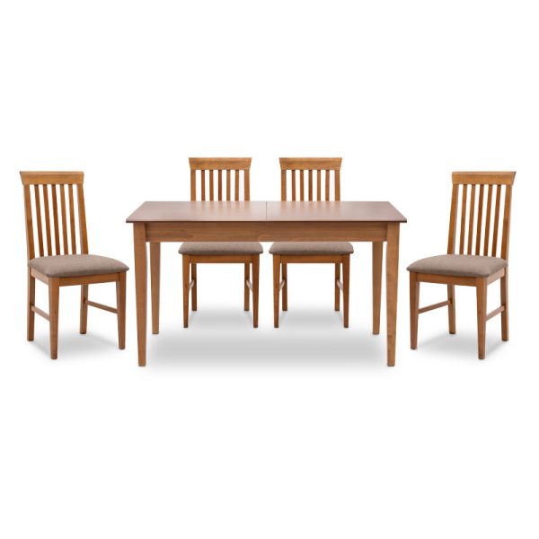Για εσάς που ψάχνετε μια τραπεζαρία σε κλασσική γραμμή, η τραπεζαρία Bergen σε χρώμα καρυδί είναι η ιδανική επιλογή και θα ταιριάξει σε κάθε σπίτι. Ο σκελετός του τραπεζιού και των καρεκλών είναι κατασκευασμένος από μασίφ ξύλο οξιάς που τον καθιστά στιβαρό και υψηλών αντοχών στο χρόνο. Η επιφάνεια του τραπεζιού είναι κατασκευασμένη από MDF εξαιρετικής ποιότητας. Η τραπεζαρία αποτελείται από ένα επεκτεινόμενο τραπέζι και τέσσερις καρέκλες.