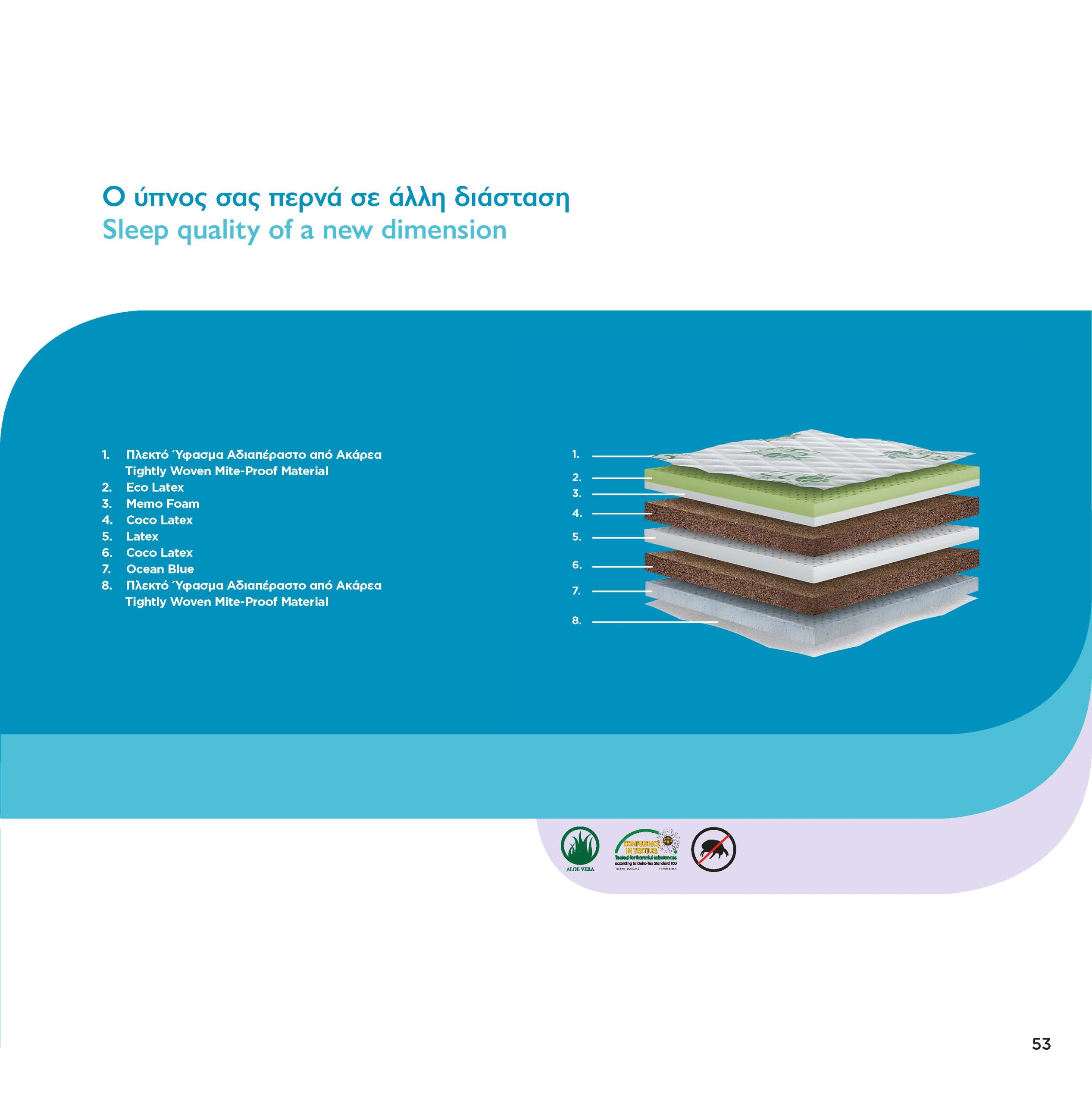 Ο συνδυασμός αφρού, λατέξ και καρύδας απορροφά τις δονήσεις και το στρώμα ταιριάζει απόλυτα στο σχήμα του σώματος. Προσφέρει υγιή ύπνο, προστατεύει από τις αλλεργίες και αποτρέπει την ανάπτυξη βακτηριδίων.