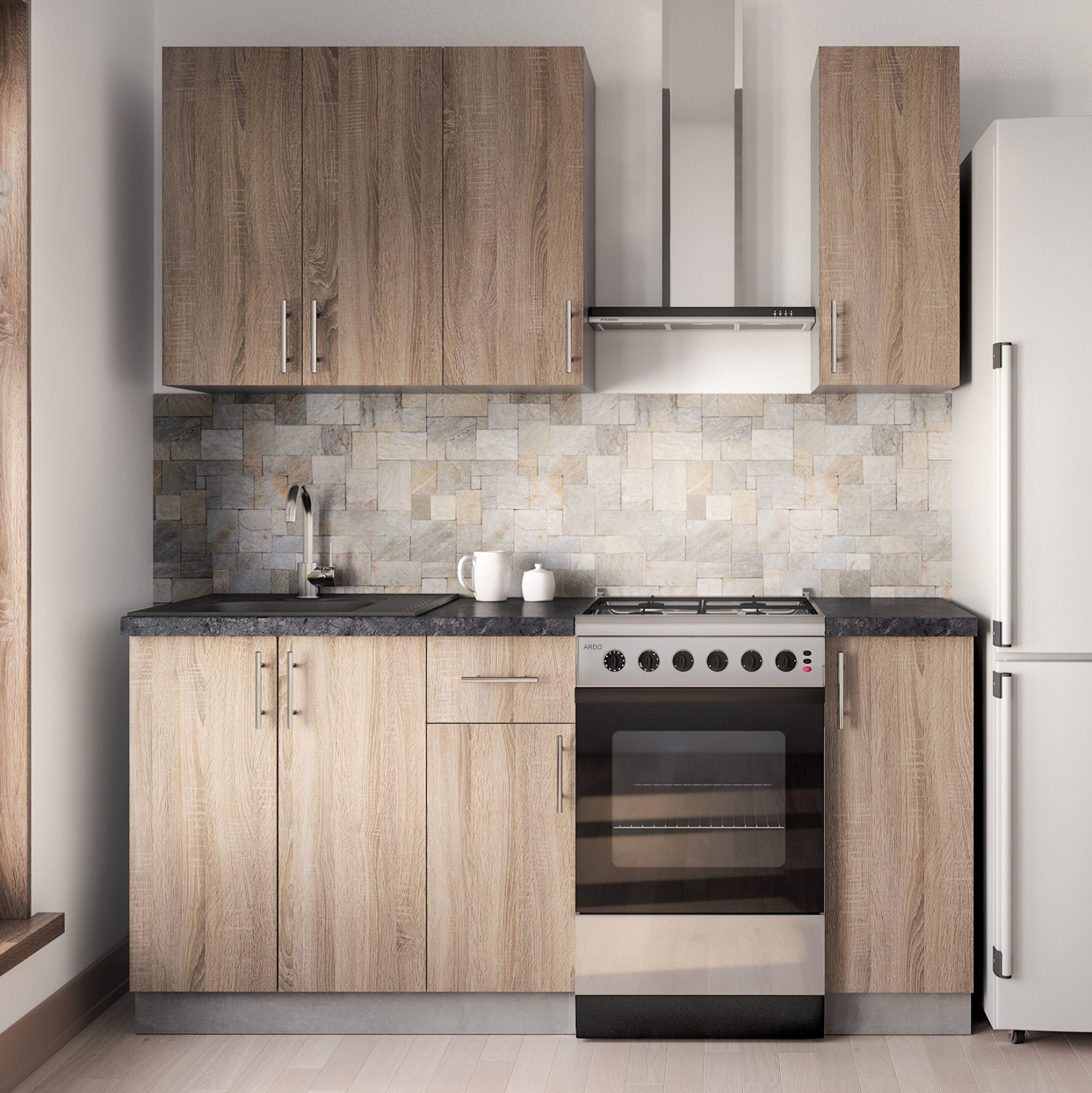 Σύνθεση κουζίνας—-Σας παρουσιάζουμε την καινούργια σειρά με συνθέσεις για την κουζίνα που έχουμε προσθέσει στην γκάμα μας. Αυτή η σύνθεση μελαμίνης σε χρώμα σκούρο SONOMA και πλαινά σε χρώμα τσιμεντί, αποτελείται από 1 διπλό και 2 μονά ντουλάπια τοίχου ενώ η επιδαπέδια μονάδα αποτελείται από 1 διπλό ντουλάπι κάτω από τον μονό νεροχύτη, ένα συρτάρι με ένα κοντύτερο ντουλάπι δίπλα, κι ένα μονό ντουλάπι στην γωνία. Οι πάγκοι της σύνθεσης έχουν χρώμα μαύρου μαρμάρου και δημιουργούν μια πανέμορφη διχρωμία που δίνει μια ξεχωριστή όψη στην κουζίνα σας, ενώ το υλικό κατασκευής τους σας επιτρέπει να τους χρησιμοποιείτε με σχετική άνεση γιατί είναι ανθεκτικοί σε διάφορα είδη καταπόνησης.