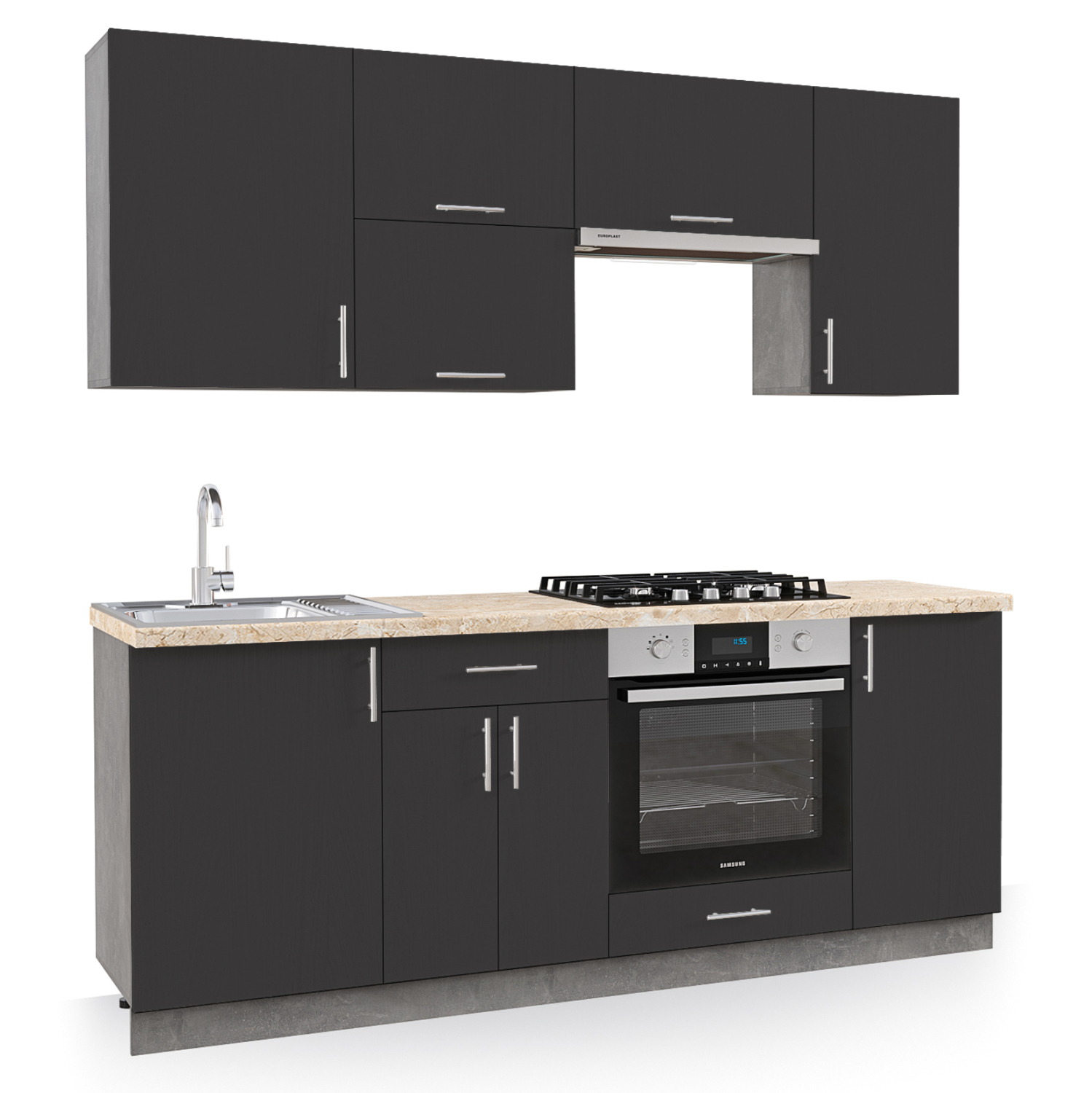 Σύνθεση κουζίνας—-Σας παρουσιάζουμε την καινούργια σειρά με συνθέσεις για την κουζίνα που έχουμε προσθέσει στην γκάμα μας. Αυτή η σύνθεση είναι σε μεγάλη διάσταση και σε ΑΝΘΡΑΚΙ χρώμα και πλαινά και μπάζα σε τσιμεντί. Τα ντουλάπια του τοίχου αποτελούνται από 1 μεγάλο ντουλάπι και 3 ντουλάπια με πόρτες που ανοίγουν οριζόντια. Το ένα από αυτά τα ντουλάπια τοποθετείται ακριβώς επάνω από τον απορροφητήρα της κουζίνας και «κρύβει» την σωλήνα του. Τέλος, ένα ακόμα ντουλάπι υπάρχει στην άκρη της επάνω κατασκευής. Η επιδαπέδια κατασκευή αποτελείται από 1 μεγάλο ντουλάπι κάτω από τον μονό νεροχύτη, ένα μακρύ συρτάρι κι ένα ακόμα διπλό ντουλάπι από κάτω, και τέλος ένα ακόμα διπλό ντουλάπι στην άκρη. Το χαρακτηριστικό όμως αυτής της σύνθεσης είναι ότι η ηλεκτρική κουζίνα ενσωματώνεται στην κατασκευή και υπάρχει ένα ακόμα συρτάρι κάτω από την κουζίνα. Όλες οι πόρτες στα ντουλάπια έχουν μοντέρνα ΙΝΟΧ χερούλια. Οι πάγκοι της σύνθεσης έχουν χρώμα και όψη μπεζ μαρμάρου και δεν δημιουργούν έντονη διχρωμία, ενώ το υλικό κατασκευής τους σας επιτρέπει να τους χρησιμοποιείτε με άνεση γιατί είναι ανθεκτικοί σε διάφορα είδη καταπόνησης.