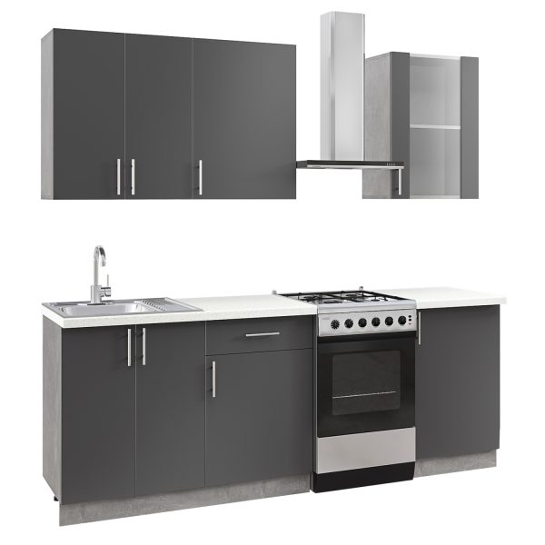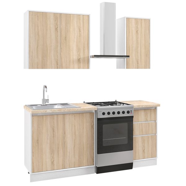 Σύνθεση κουζίνας—-Σας παρουσιάζουμε την καινούργια σειρά με συνθέσεις για την κουζίνα που έχουμε προσθέσει στην γκάμα μας. Αυτή η σύνθεση είναι σε μεγάλη διάσταση και σε χρώμα σκούρο SONOMA. Τα ντουλάπια του τοίχου αποτελούνται από 1 διπλό ντουλάπι και 4 ντουλάπια με πόρτες που ανοίγουν οριζόντια. Η επιδαπέδια μονάδα αποτελείται από 1 διπλό ντουλάπι κάτω από τον μονό νεροχύτη, ένα μακρύ συρτάρι κι ένα ακόμα διπλό ντουλάπι από κάτω, και τέλος ένα ακόμα διπλό ντουλάπι στην άκρη. Όλες οι πόρτες στα ντουλάπια έχουν μοντέρνα ΙΝΟΧ χερούλια. Οι πάγκοι της σύνθεσης έχουν χρώμα και όψη μαύρου μαρμάρου και δημιουργούν μια όμορφη διχρωμία, ενώ το υλικό κατασκευής τους σας επιτρέπει να τους χρησιμοποιείτε με άνεση γιατί είναι ανθεκτικοί σε διάφορα είδη καταπόνησης.