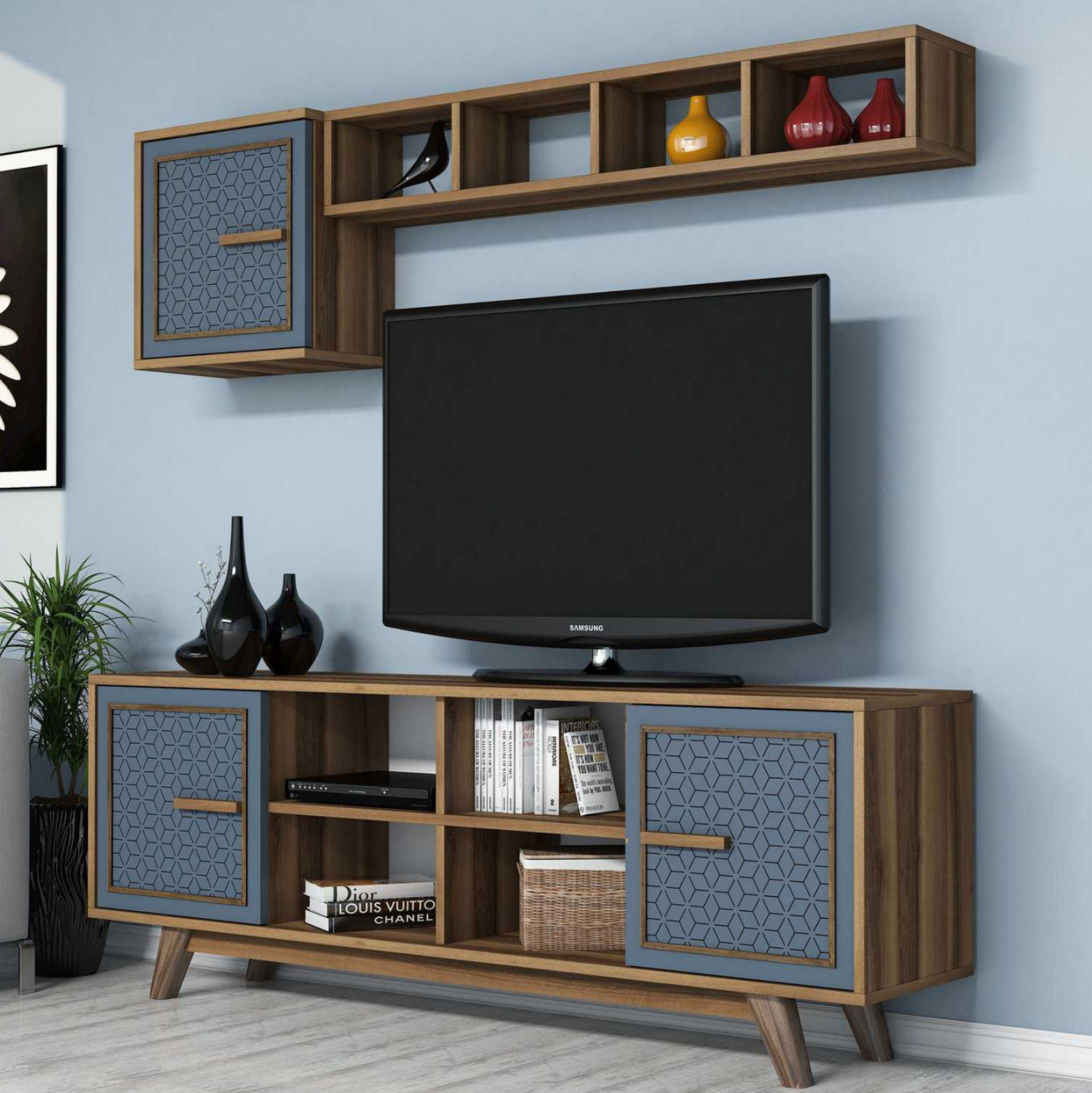 Το ΗΜ9513.02 είναι μια μοντέρνα και λειτουργική σύνθεση τηλεόρασης σε ΚΑΡΥΔΙ-ΜΠΛΕ χρώμα, που θα ομορφύνει το σαλόνι σας! Αποτελείται από το κυρίως έπιπλο και από ένα ντουλάπι τοίχου με μπλε πόρτα και όμορφα ραφάκια. Το κυρίως έπιπλο είναι μακρύ και διαθέτει δυο ντουλάπια δεξιά-αριστερά με όμορφο σχέδιο στις μπλε πόρτες και χερούλια από το ίδιο υλικό. Στην μέση υπάρχει ανοιχτός χώρος τοποθέτησης αντικειμένων χωρισμένος σε 4 μέρη. Η σύνθεση ολοκληρώνεται με ένα ντουλάπι τοίχου και ένα μακρόστενο ράφι χωρισμένο επίσης σε 4 μέρη. Μια σύνθεση που αλλάξει και θα αναβαθμίσει την εικόνα του σαλονιού σας!