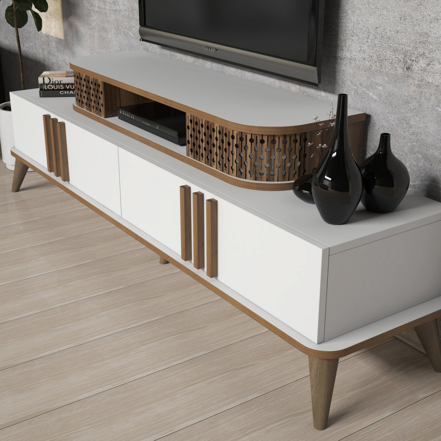 Το ΗΜ9515.03 είναι μια μοντέρνα και λειτουργική σύνθεση τηλεόρασης σε ΛΕΥΚΟ και ΚΑΡΥΔΙ χρώμα, που θα ομορφύνει το σαλόνι σας! Αποτελείται από το κυρίως έπιπλο δαπέδου το οποίο διαθέτει 2 ντουλάπια, καθώς και 1 μακρύ ράφι τοίχου. Η ιδιαιτερότητα αυτής της σύνθεσης είναι ένα επιπλέον μικρότερο ράφι επάνω στο κυρίως έπιπλο με ανοιχτό χώρο τοποθέτησης συσκευών και με όμορφο σκαλιστό σχέδιο. Πρόκειται για μια κομψή πρόταση για το σαλόνι σας.
