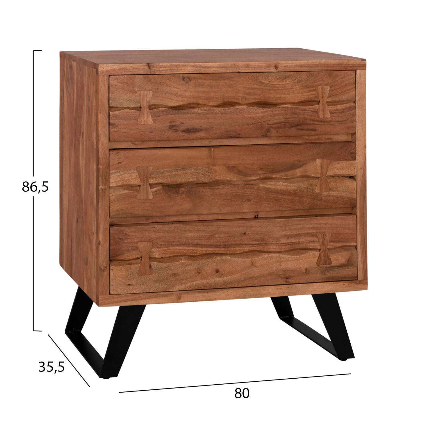 Χειροποίητη συρταριέρα από μασίφ ξύλο Ακακίας σε φυσική απόχρωση και μεταλλικά πόδια σε μαύρο χρώμα.