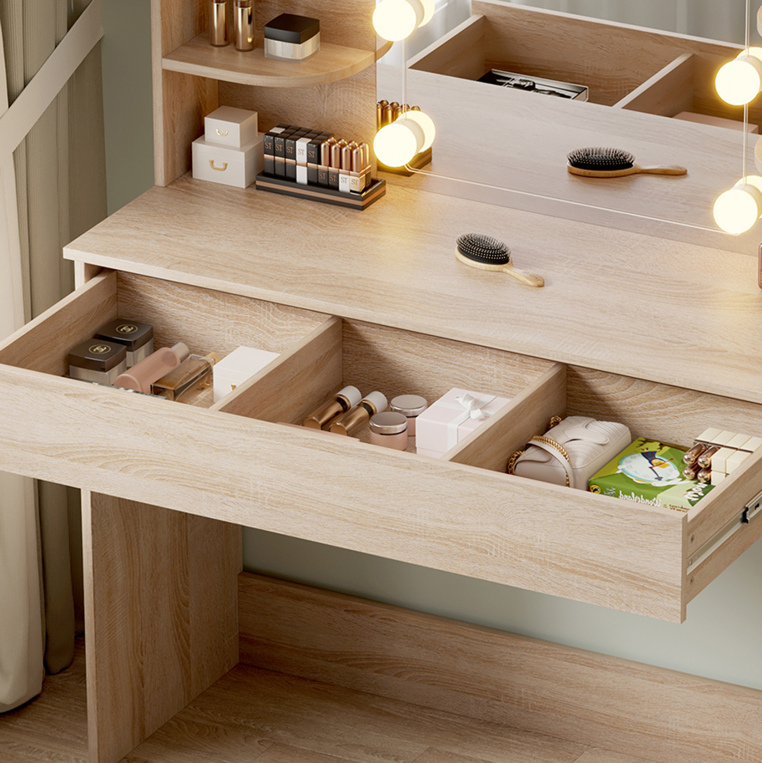 Η νέα τουαλέτα LAURYN είναι ένα πρακτικότατο έπιπλο σε SONAMA χρώμα που θα αλλάξει την εικόνα του χώρου σας. Αποτελείται από ένα τραπέζι με καθρέπτη και 2 συρτάρια κάτω από την επιφάνεια. Αυτό όμως που κερδίζει τις εντυπώσεις είναι ότι ο καθρέπτης είναι τοποθετημένος στο κέντρο και συνοδεύεται από φώτα LED περιμετρικά, καθώς και από ράφια τοποθέτησης αντικειμένων δεξιά κι αριστερά, απογειώνοντας την χρησιμότητα του επίπλου.