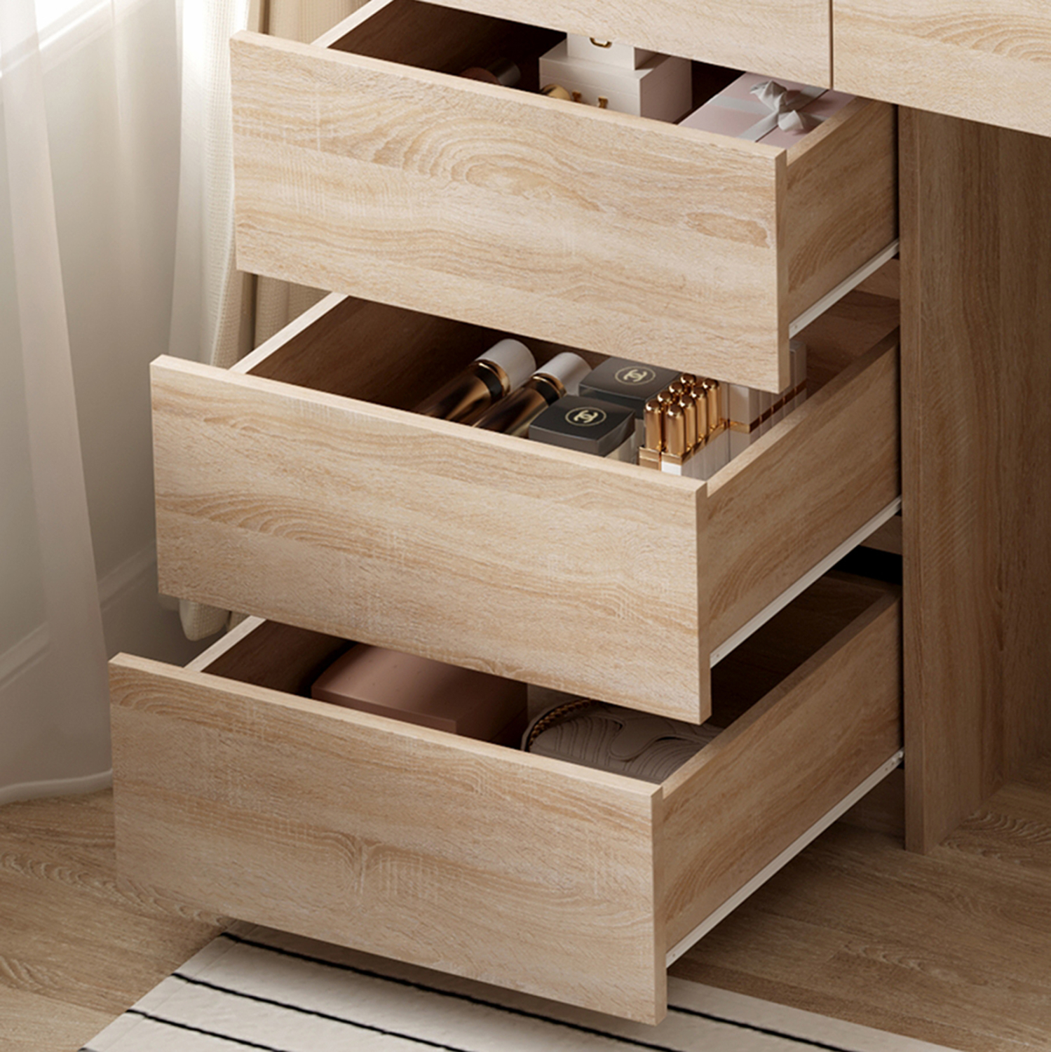 Η τουαλέτα BEYON είναι άλλη μια καινούργια προσθήκη στην γκάμα μας. Πρόκειται για ένα πρακτικότατο έπιπλο σε χρώμα SONAMA που θα αλλάξει την εικόνα του χώρου σας. Αποτελείται από ένα τραπέζι με καθρέπτη και 5 συρτάρια. 2 συρτάρια μακρόστενα κάτω από την επιφάνεια, κι άλλα 3 μεγαλύτερα στην αριστερή πλευρά σαν συρταριέρα. Αυτή η συρταριέρα είναι κινητή, και επιτρέπει το υπόλοιπο έπιπλο να “πατάει” επάνω της και στην ουσία να μεγαλώνει τον χώρο στο κάτω μέρος, αλλά και να δημιουργεί ακόμα μία επιφάνεια τοποθέτησης αντικειμένων! Αυτό όμως που κερδίζει τις εντυπώσεις είναι ότι ο καθρέπτης συνοδεύεται από φώτα LED περιμετρικά, απογειώνοντας την χρησιμότητα του επίπλου.