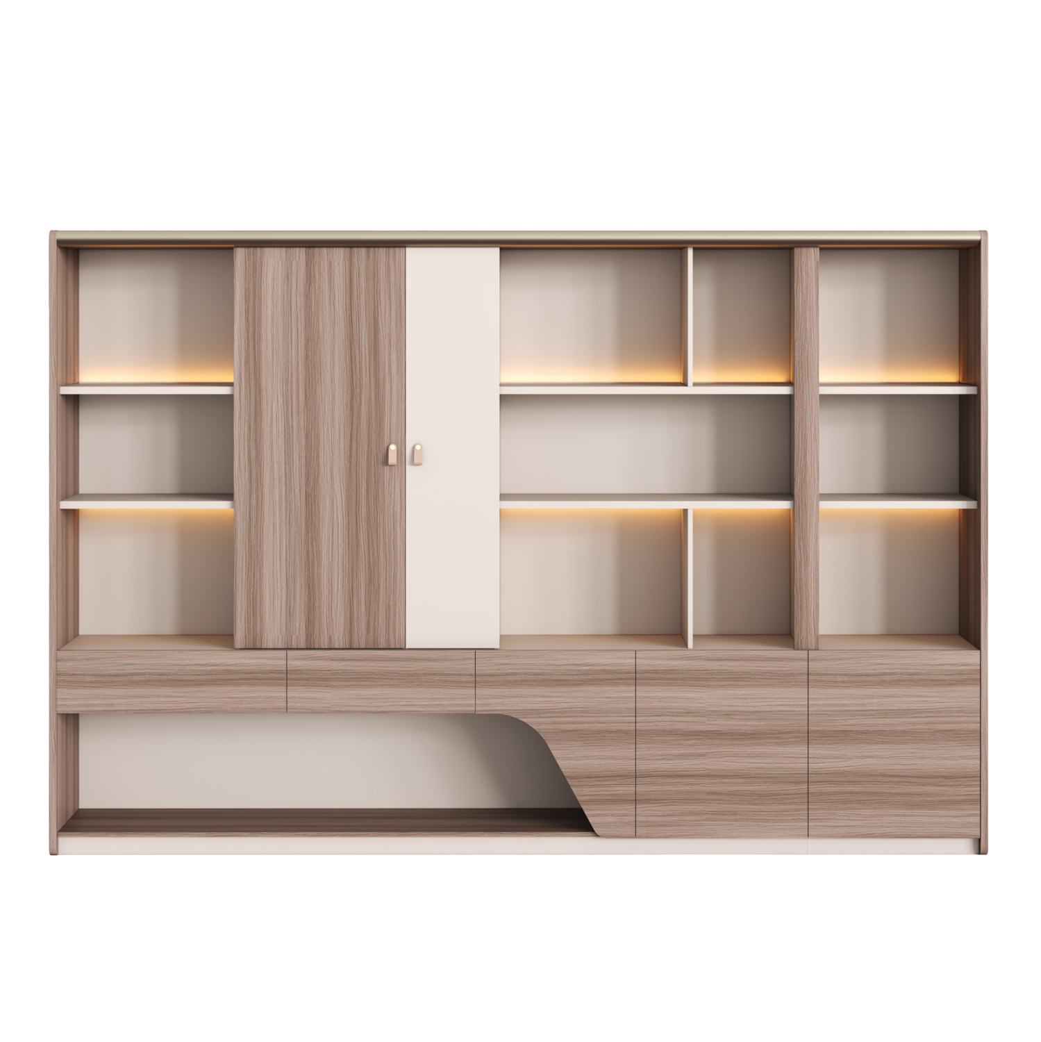 Διαθέτει ενσωματωμένο φωτισμό LED, ο οποίος αναδεικνύει τόσο τα ανοιχτά ράφια όσο και το συνολικό design, δημιουργώντας ένα premium αποτέλεσμα. Το κάτω μέρος αποτελείται τόσο από ντουλάπια και συρτάρια, ιδανικά για αποθήκευση αρχείων και αντικειμένων που δεν χρειάζεται να είναι ορατά, όσο και από ανοιχτό χώρο αποθήκευσης. Στο επάνω κεντρικό τμήμα υπάρχουν ντουλάπια με ράφια, ενώ οι ανοιχτοί αποθηκευτικοί χώροι διαθέτουν έτοιμη εγκατάσταση LED φωτισμού.
